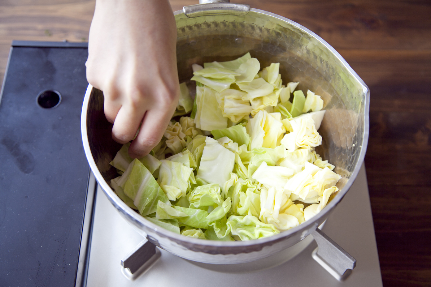 鍋に春キャベツ、あさり、酒を入れて蓋をして中火にかける。