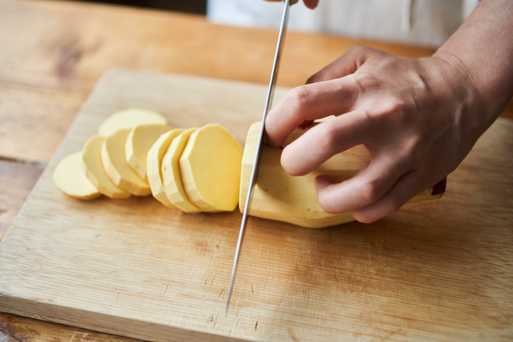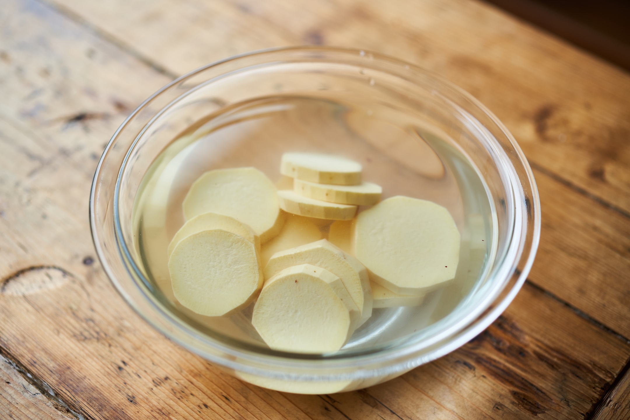 さつまいもは皮を剥いて1cm厚さに切り、水に5分さらし、水を切る。