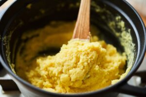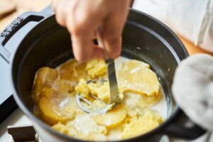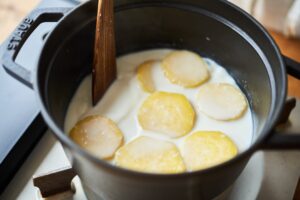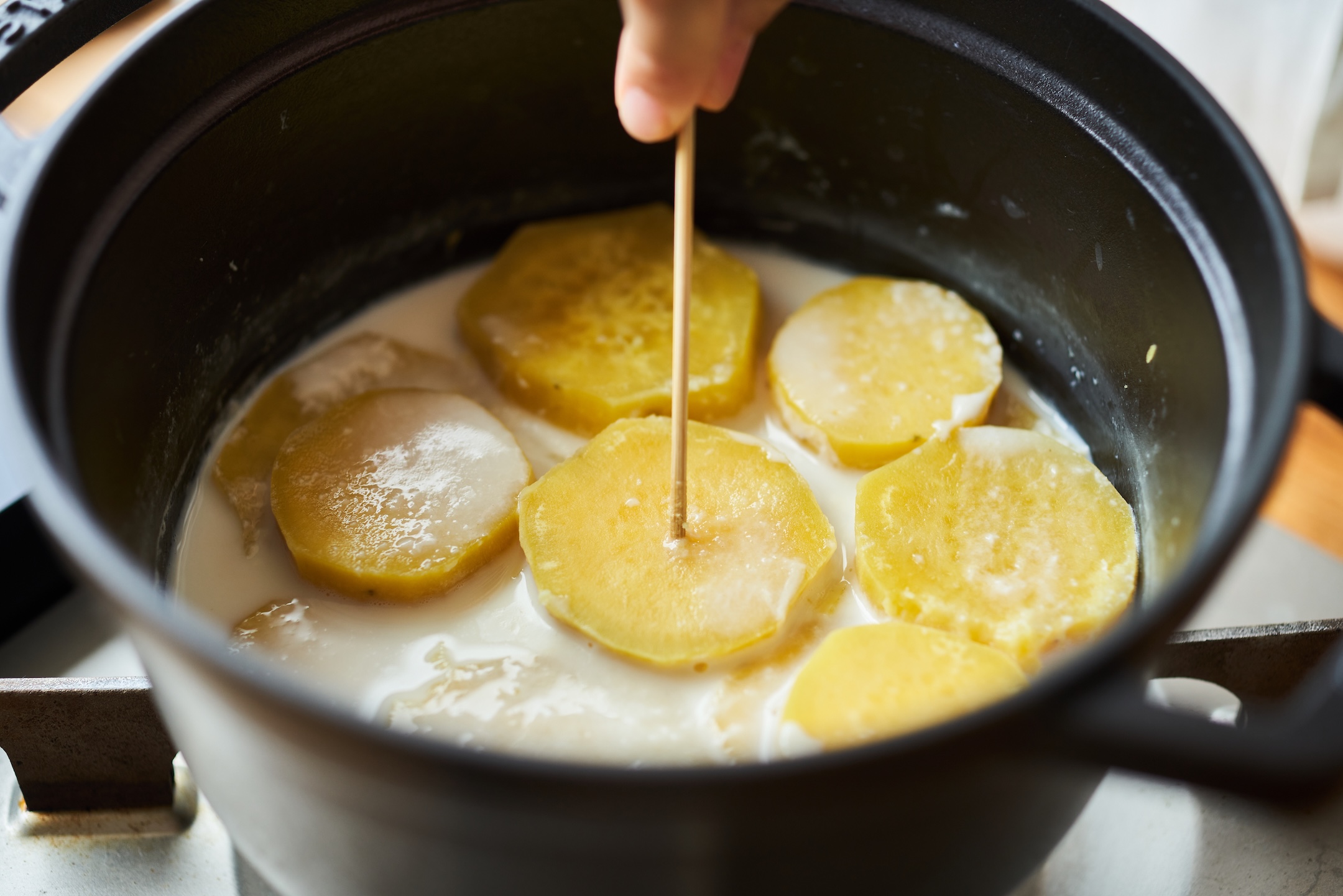 鍋にさつまいも、甘酒、牛乳、水1/2カップを入れ、中火にかける。