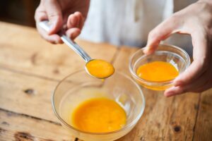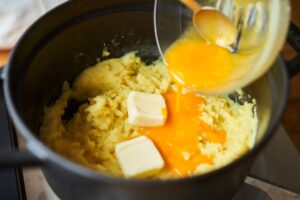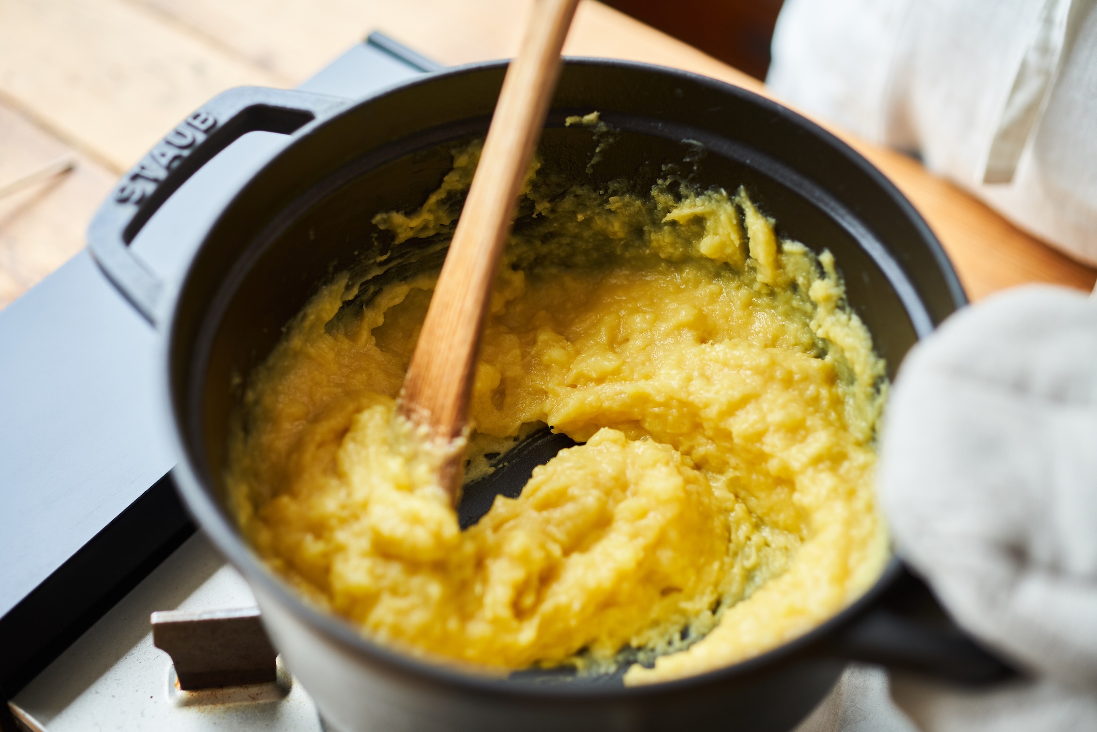 3の鍋にバター、残りの卵黄を加えて混ぜ、弱めの中火にかけて混ぜながら加熱する。