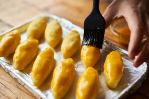 仕上げ用の卵黄を塗ってトースターで5〜10分ほど焼き、焼き色をつける。