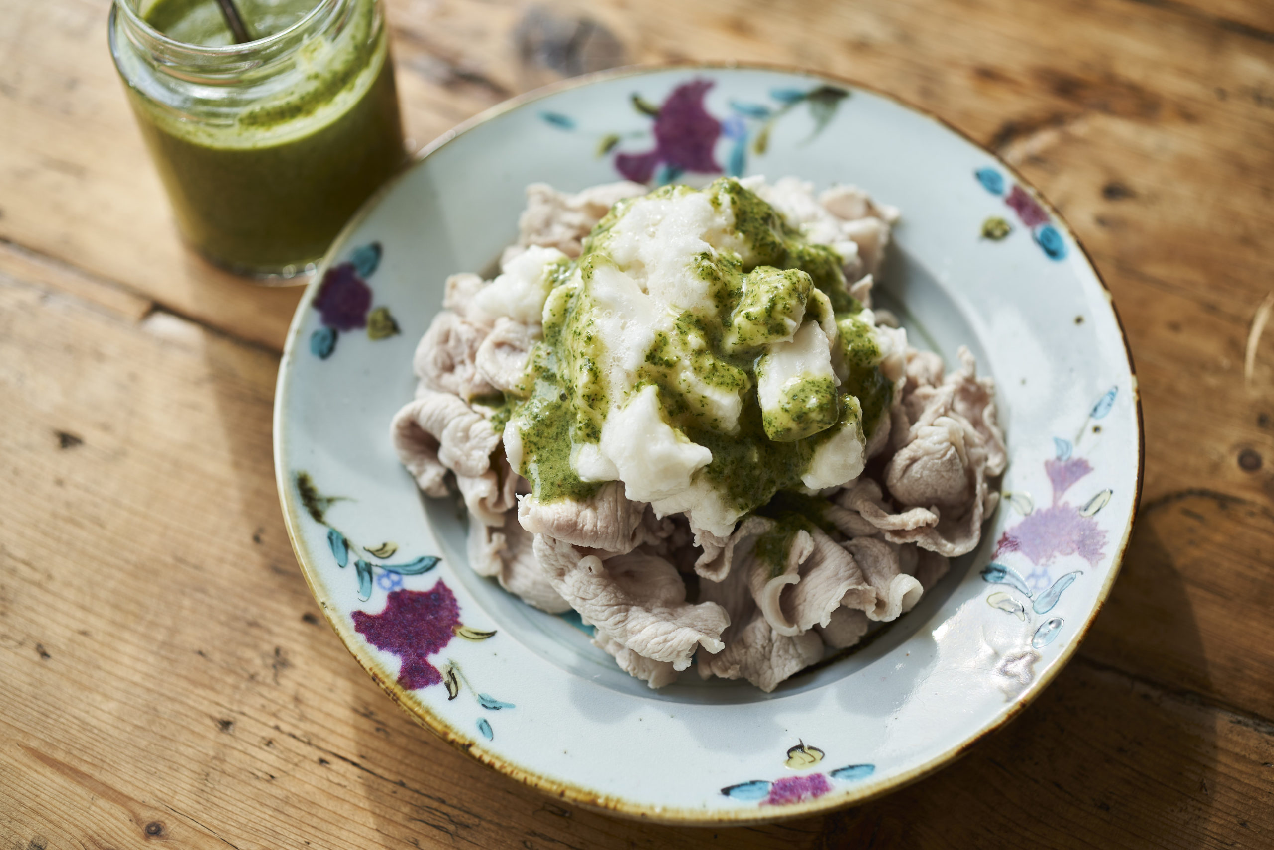 【1】鍋にたっぷりの湯を沸かし、弱火にして酒、塩(各適量/分量外)をいれて豚肉を入れ、色が変わったらすぐに取り出しざるにあげておく。