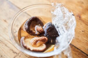 干し椎茸は水1カップに30分〜1時間つけ、ラップを敷き込んで戻す。