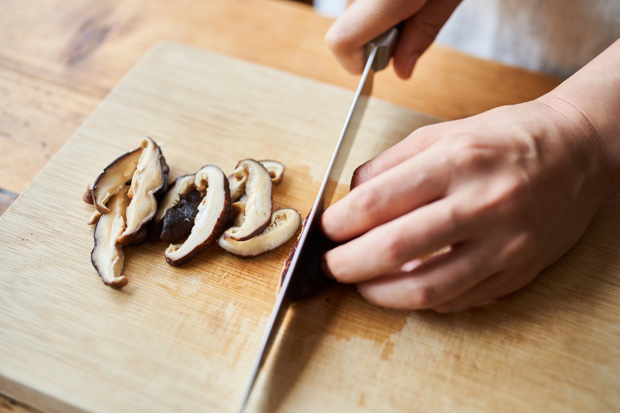 干し椎茸は、つけ汁は残して取り出し、薄切りにする。