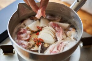 煮立ったら豚肉、しいたけ、山芋、クコの実を入れて弱火にして3〜4分加熱する。
