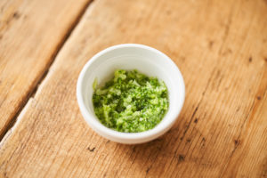 15〜20分柔らかくなるまで蒸し、みじん切りにする。蒸し汁適量を加える。