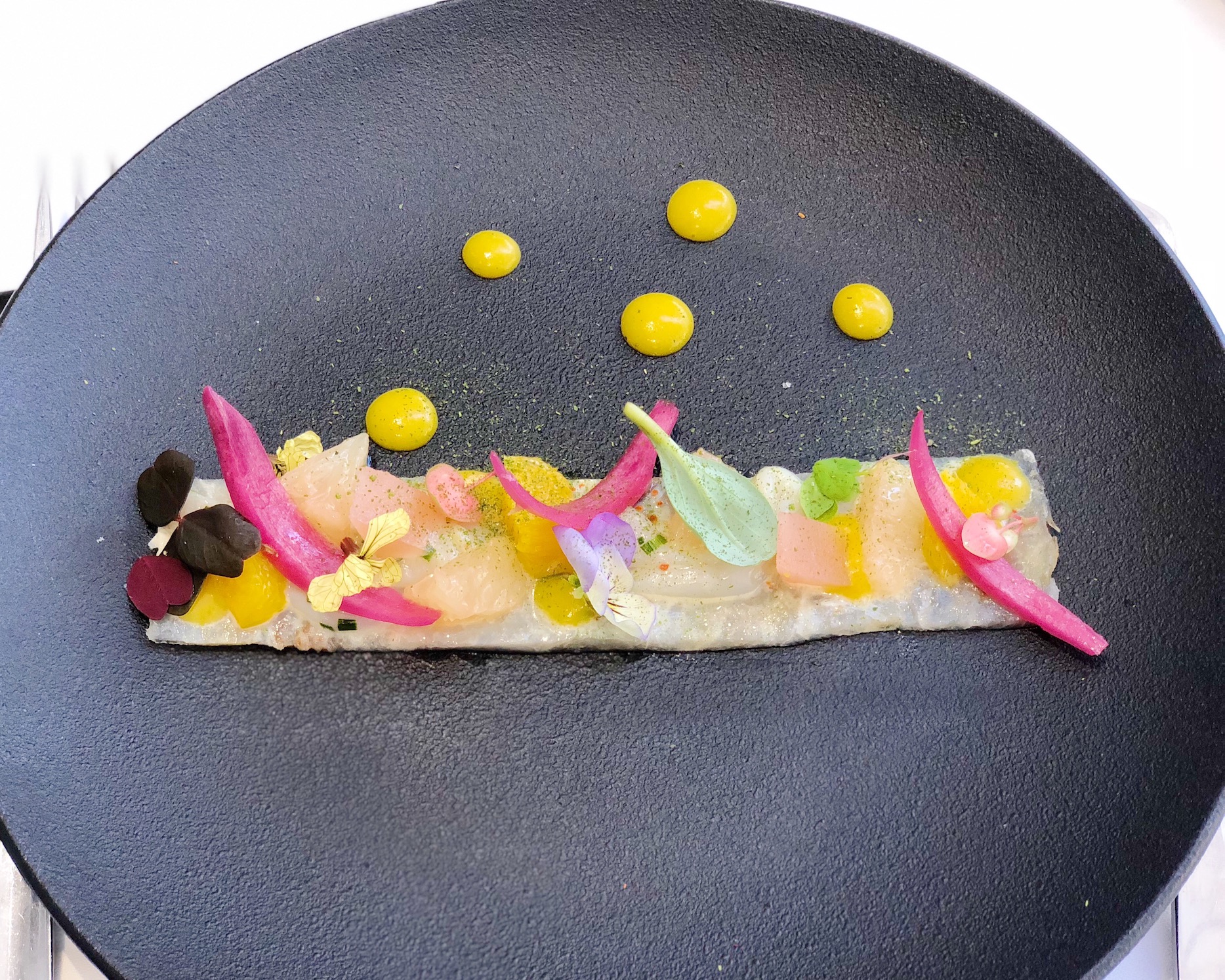 こちらはカルパッチョ。下に敷いてある四角いものがなんとお刺身です…!