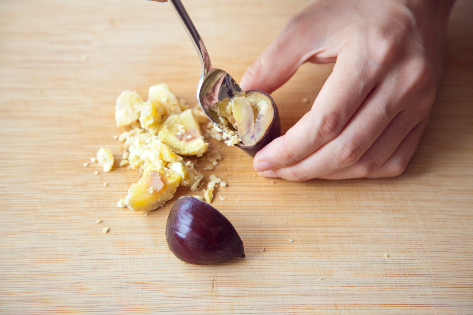 栗を縦半分に切り、スプーンで中身をくり抜く。