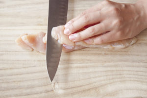 鶏肉を縦半分に切ってから、包丁をねかせて削ぐように切ります。