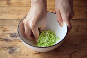 キャベツは軸をのぞいて5mm角に切ってボウルに入れ、