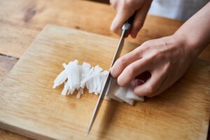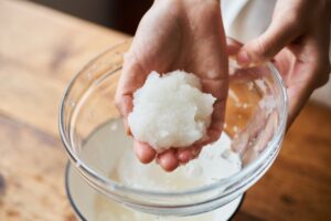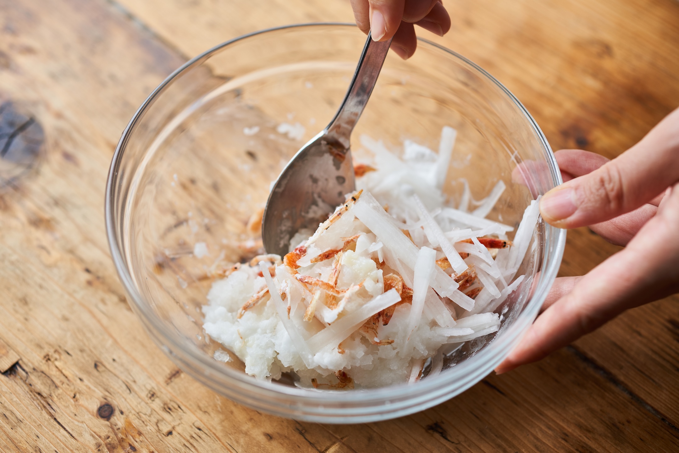 大根は皮をむいて、50g分は細切りにする。残りはすりおろし、軽く水気を絞る。