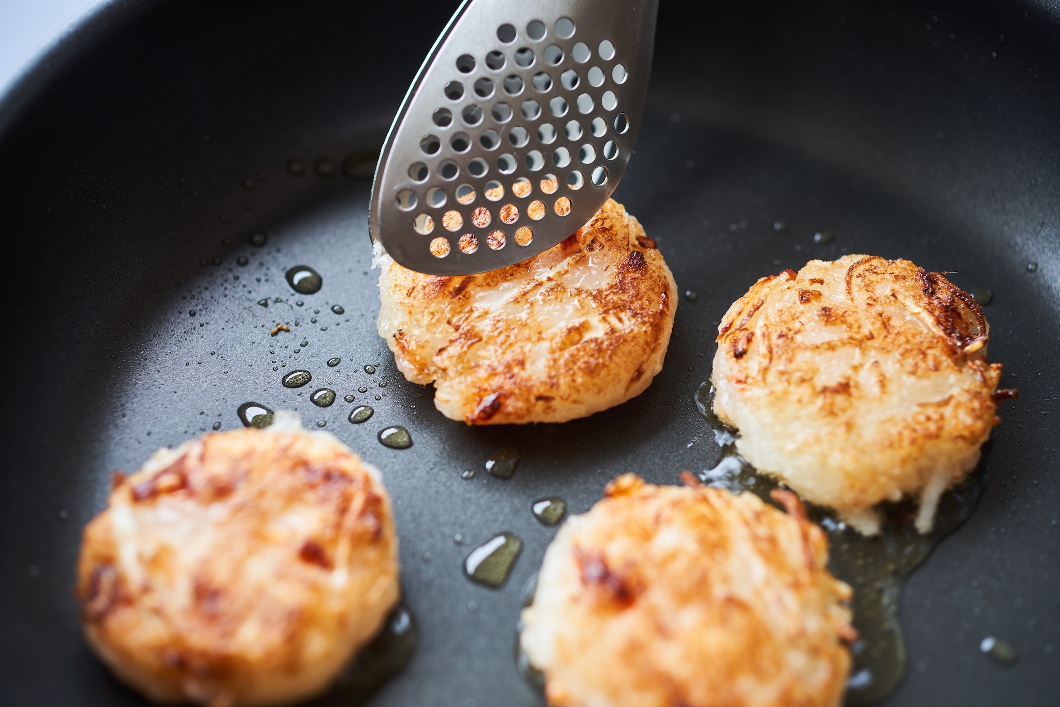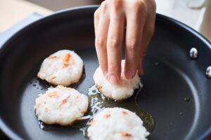フライパンにごま油を中火で熱し、2を1/4両ずつ丸く入れる。