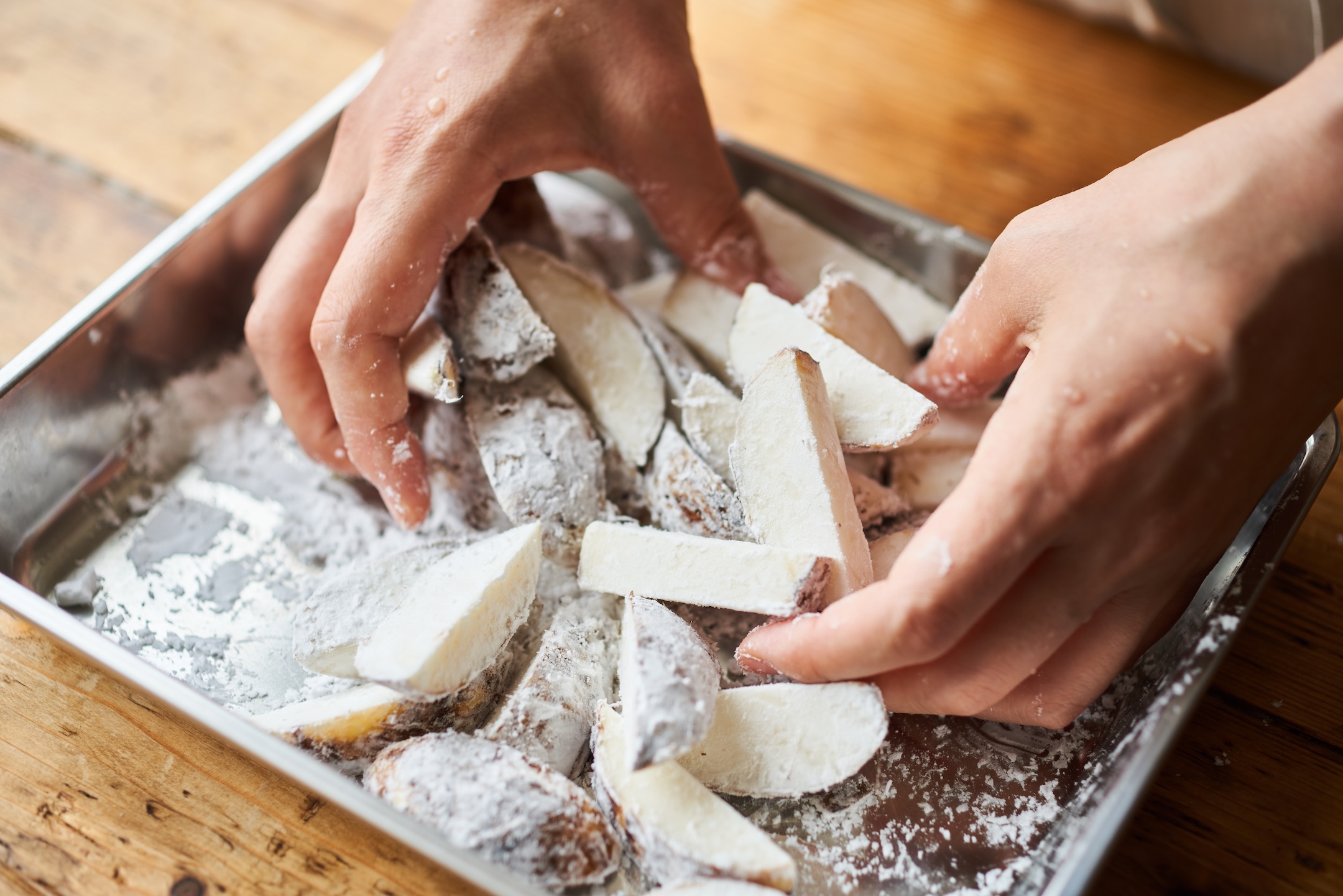 油が冷たい状態から里芋をいれるコールドスタートで里芋が甘くホクホク仕上がります!