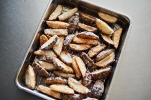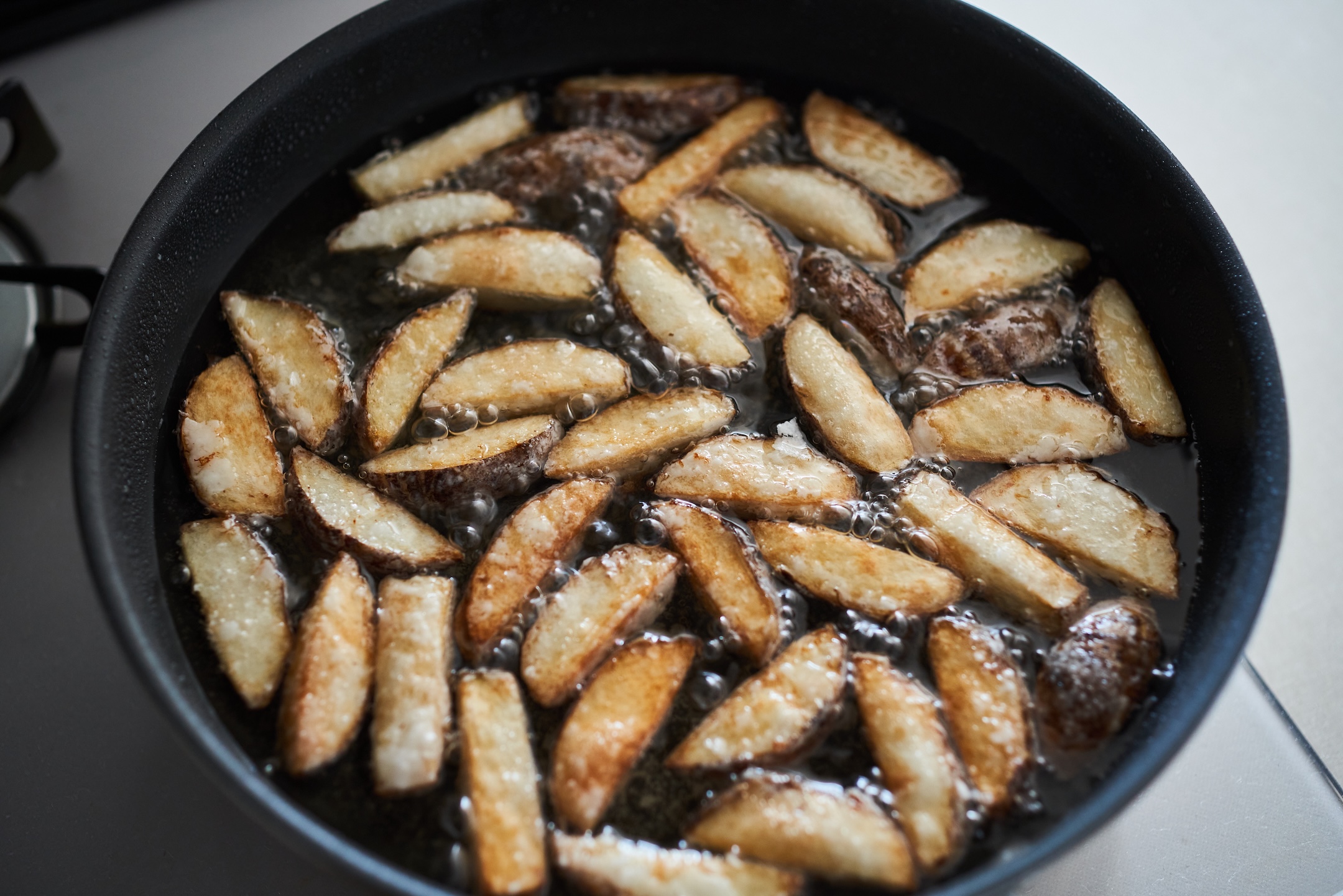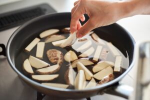 ときどき上下を返しながら10分ほどかけてよい揚げ色になるまで加熱する。