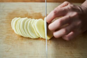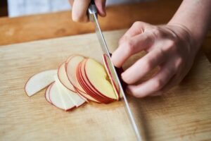りんごは4等分に切り、1/2個分は皮ごと縦に薄切り、残りは皮を剥いて縦に薄切りにする。