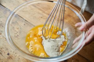 ボウルに卵を入れて泡立て器で溶き、砂糖を加えて混ぜる。