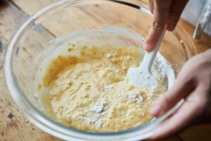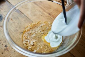 ヨーグルトを加えて混ぜ、薄力粉をふるいいれて底から返すように混ぜる。