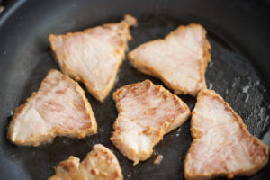 豚肉を1cm厚さに切り、弱めの中火でサラダ油を熱し