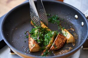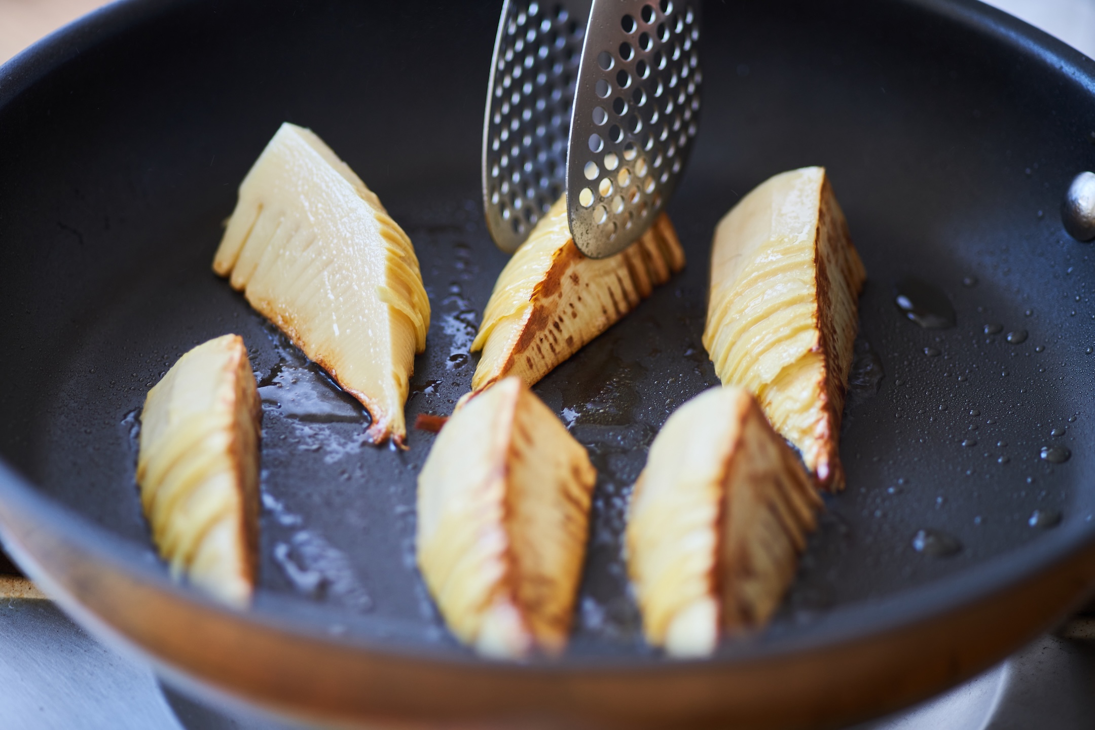 フライパンにオリーブオイルを中火で熱し、たけのこを入れて5〜6分かけて色よく焼く。
