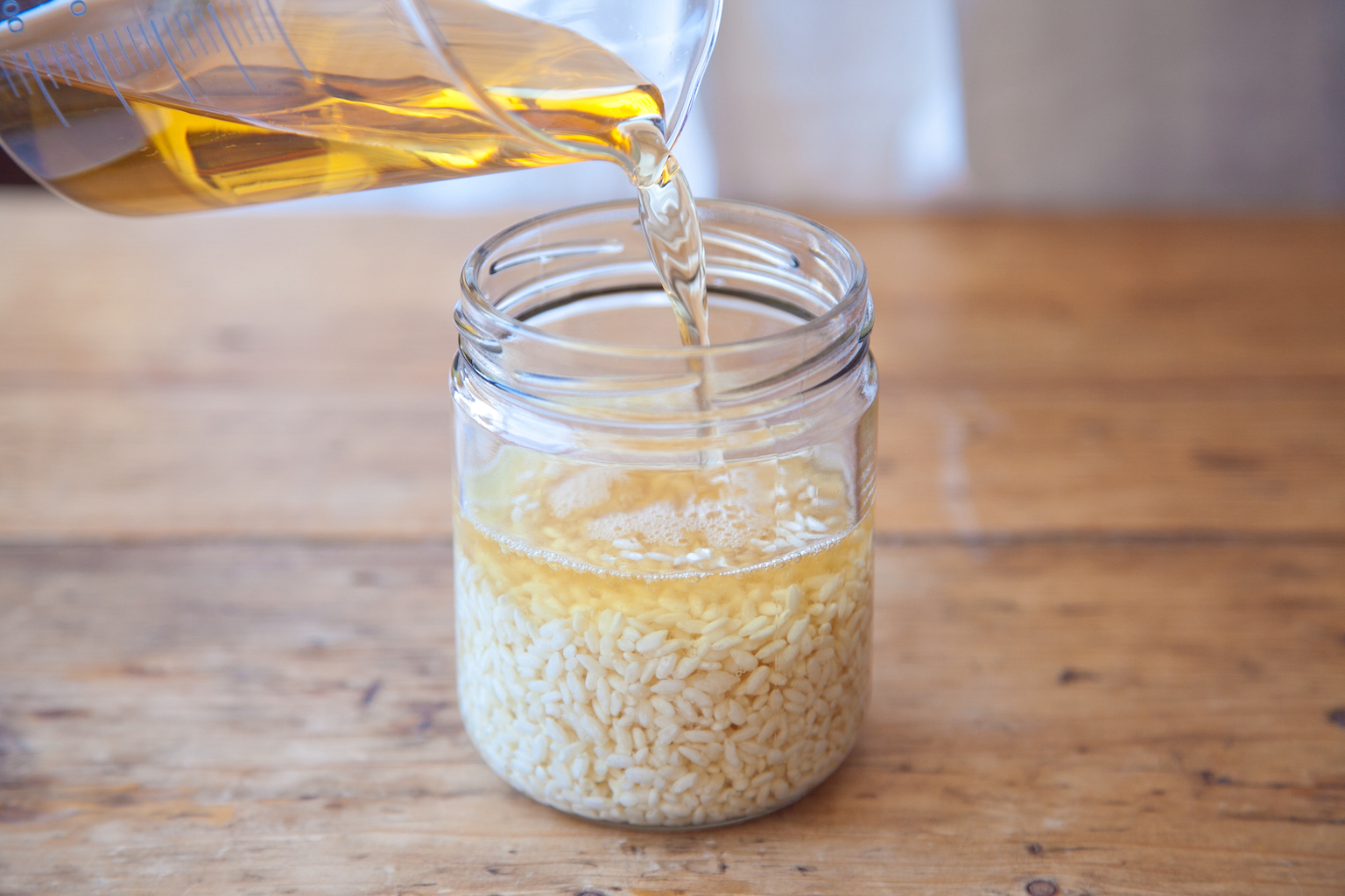 清潔な保存瓶に米麹、米酢をいれてよく混ぜ、直射日光の当たらない常温におく。