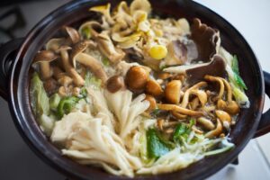 だし汁を数回に分けて入れ、焼き麩、しょうゆを加えゆるめのとろみがつくまで加熱する。
