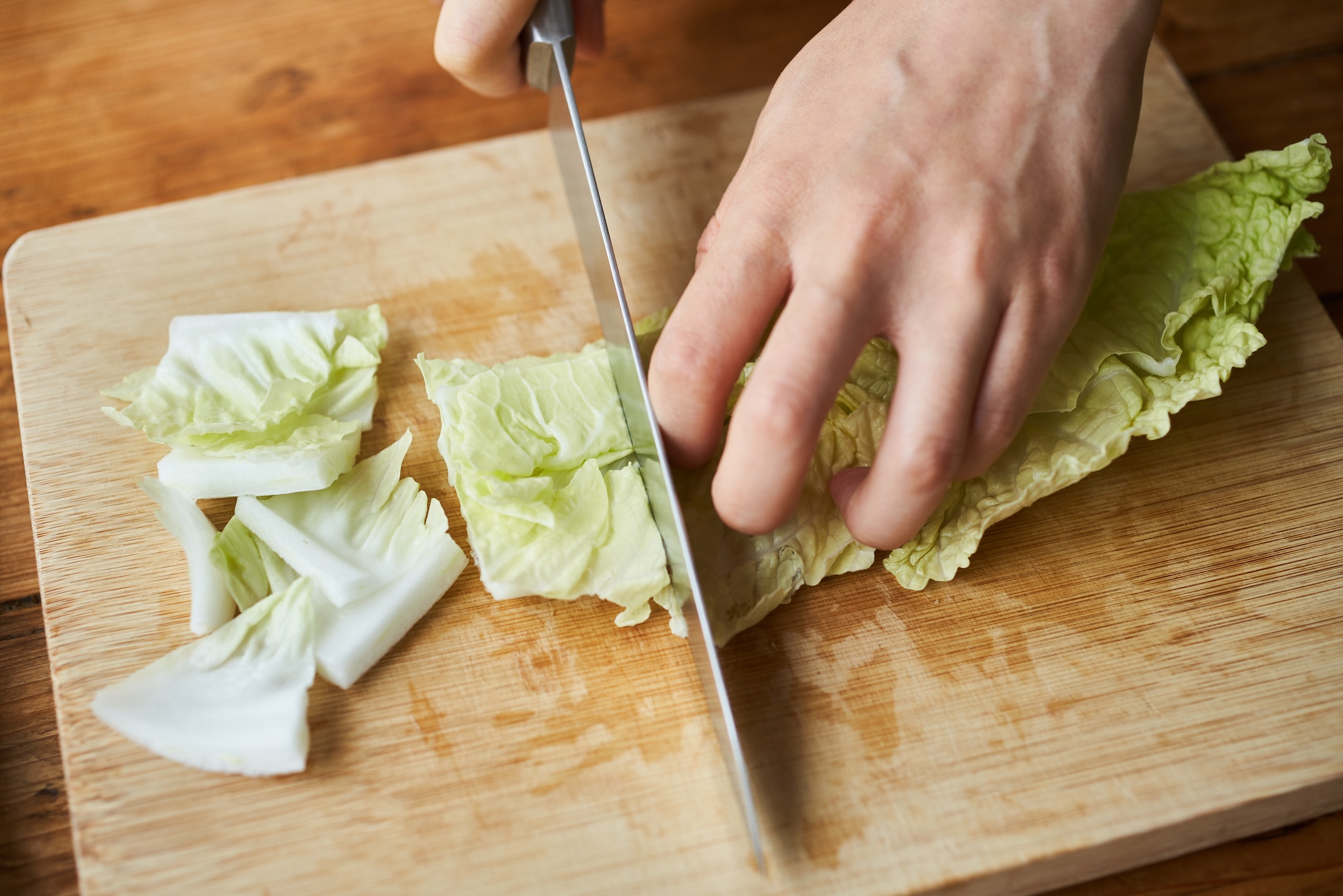 白菜は4cm四方、ベーコンは1cm幅に切る。