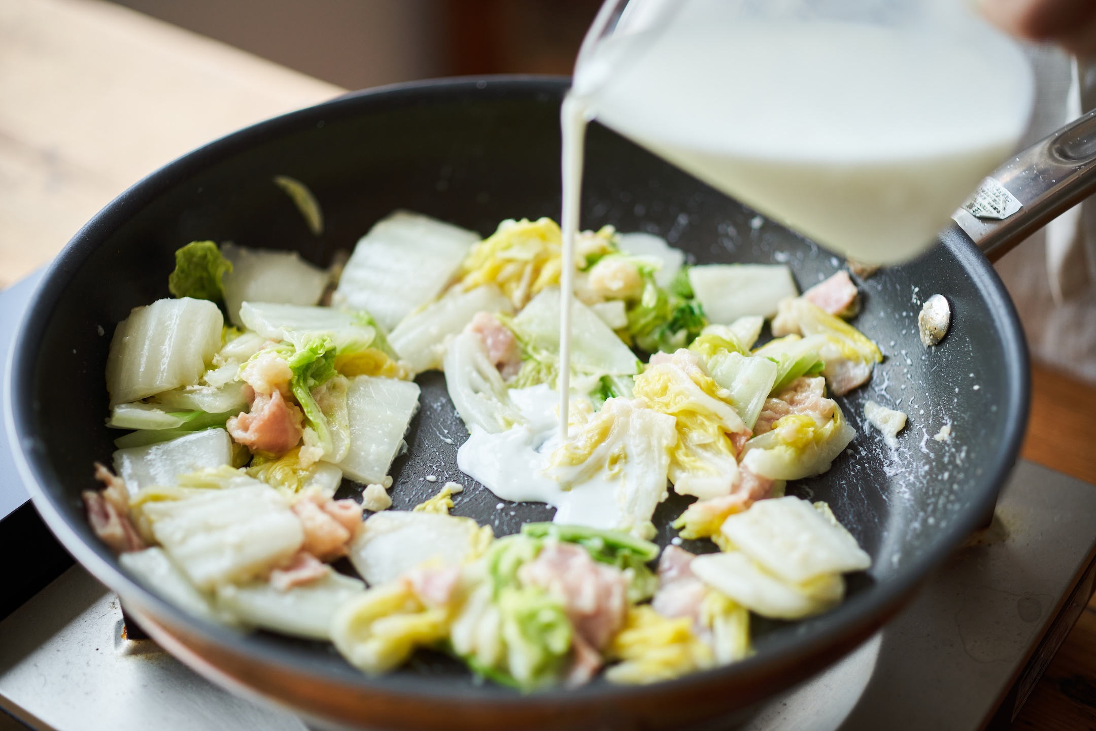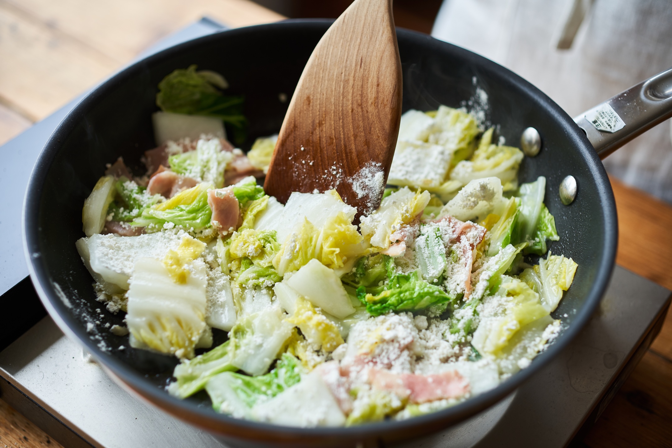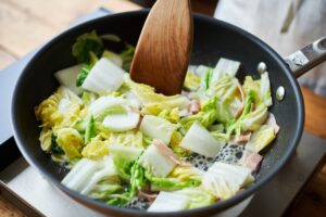 フライパンにバターを中火で熱し、白菜、ベーコンを炒める。