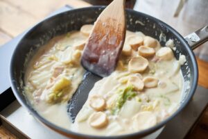 粉気がなくなったら牛乳を少しずつ加えて混ぜる。