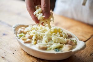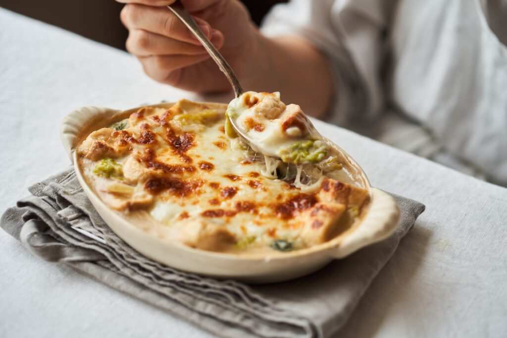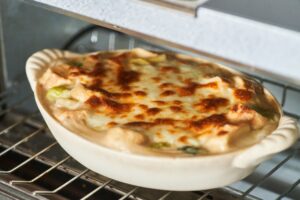 グラタン皿に4をいれてピザ用チーズをかけ、トースターで5〜10分ほど焼き色がつくまで焼く。
