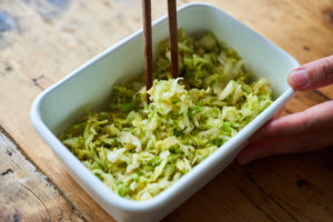 切り干し大根の水気をしっかり絞り、長ければ食べやすい長さに切って保存容器に入れる。