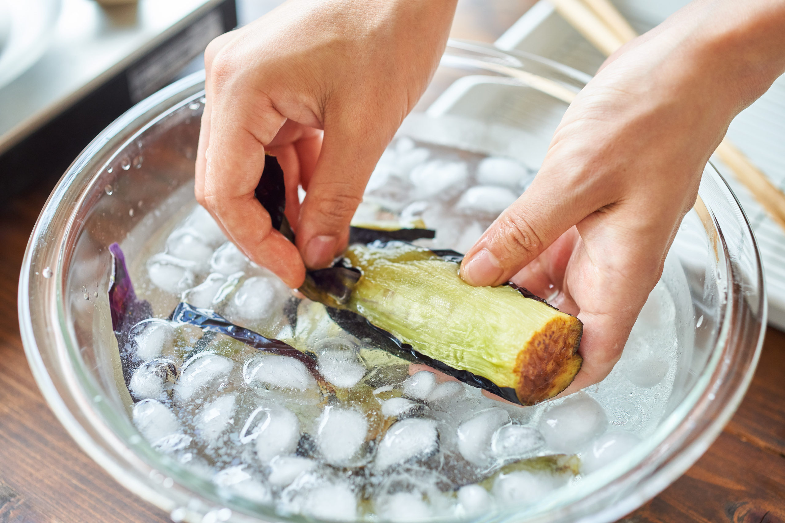 箸ではさんで少しやわらかくなったら、氷水にとって皮をむく。