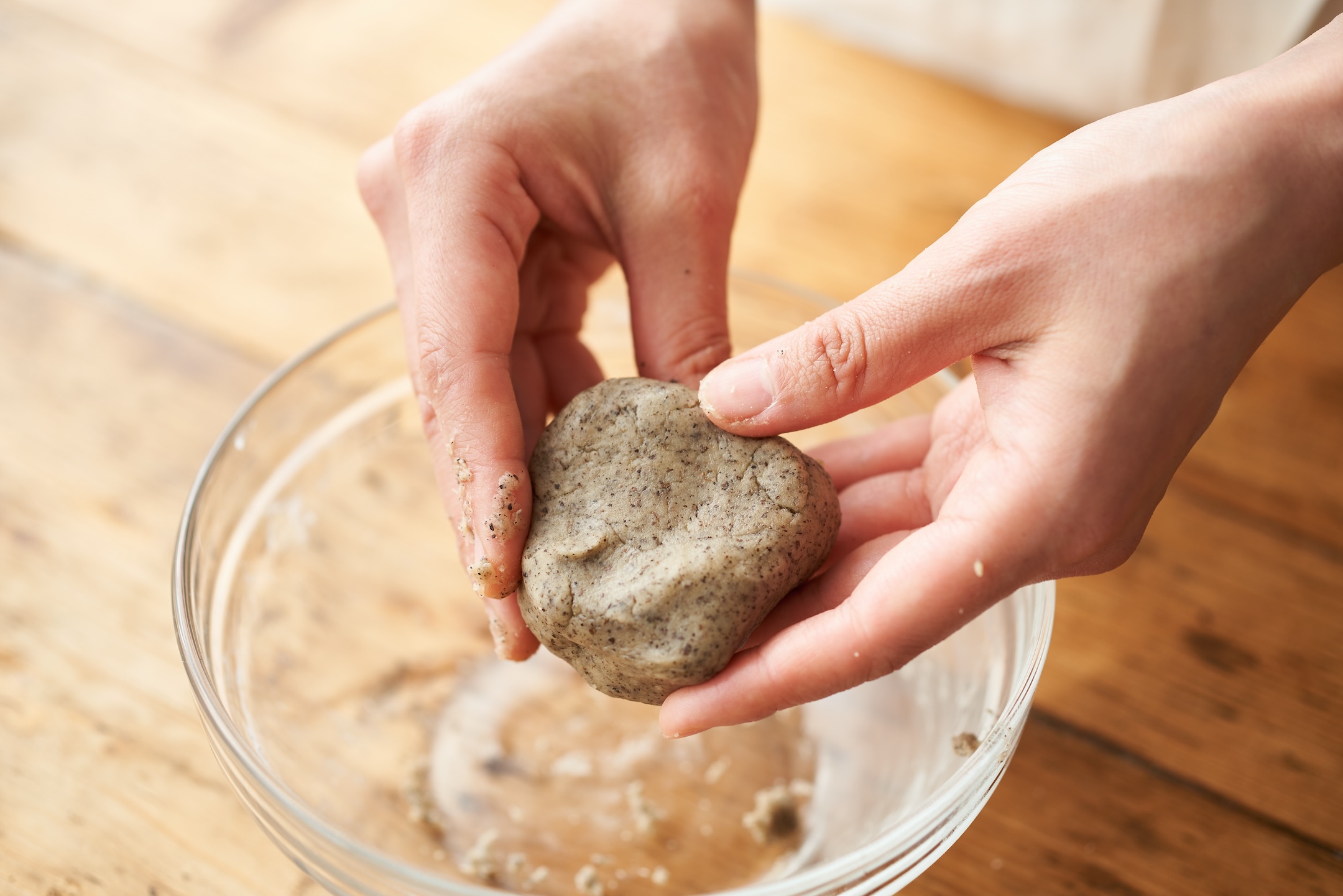 豆乳を加えまぜ、生地をひとまとまりにする。