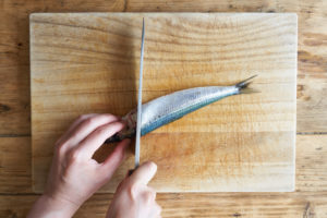 【5】いわしの中心、中骨の上に両手の親指を入れる。
