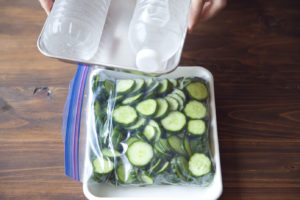 1kgの重石(500mlのペットボトル2本など)をのせ冷蔵庫に1時間〜一晩おく。