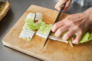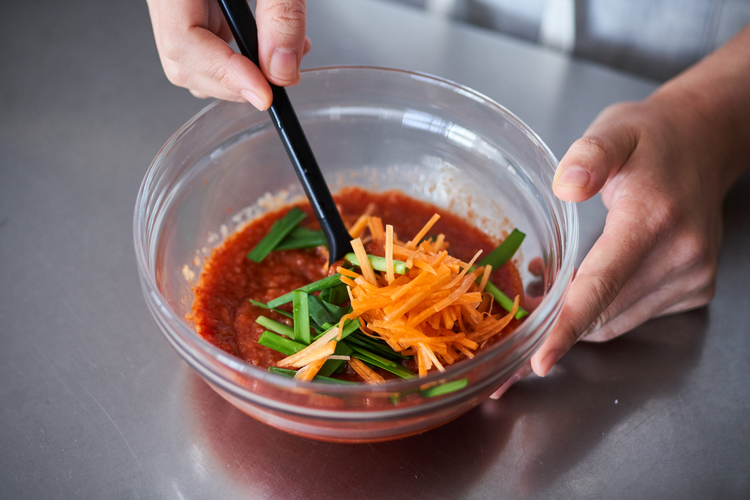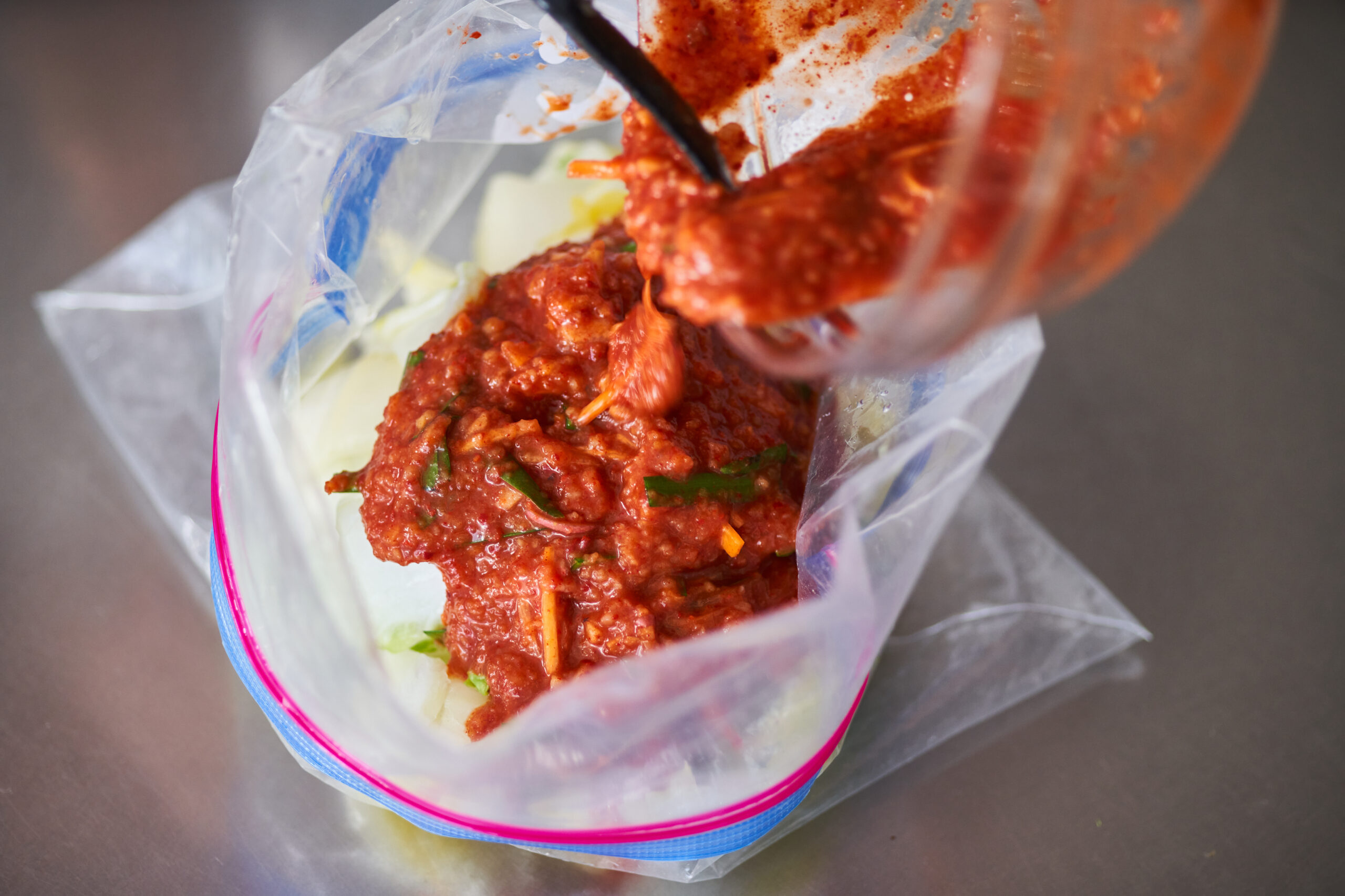 キムチの素を加えてよく揉み込み、空気を抜いて1kg程度の重石をして3〜5日間おく。ほどよい酸味と旨みが出たら完成。