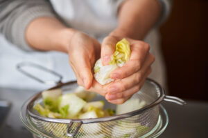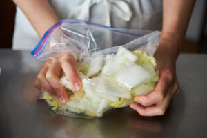 【6】白菜をペーパータオルなどで包みながら両手でしっかり絞り、ジッパー袋に入れる。