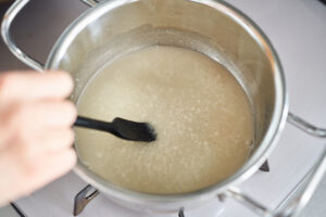 沸いたら弱火にして溶いた白玉粉を加え、混ぜながらとろみがつくまで3分ほど煮る。