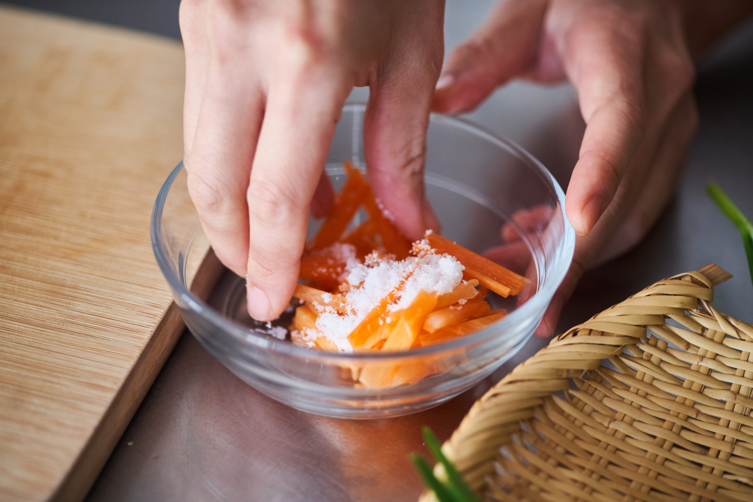 【5】にんじんを細切りにし、(B)をふり、手でもみ込む。