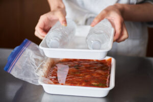 空気を抜き、2kg程度の重石(500mlペットボトル4本など)をして20分おく。