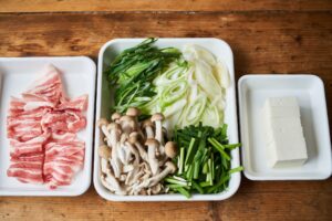 絹ごし豆腐は6等分に切る。豚バラ肉 5cm幅に切る。