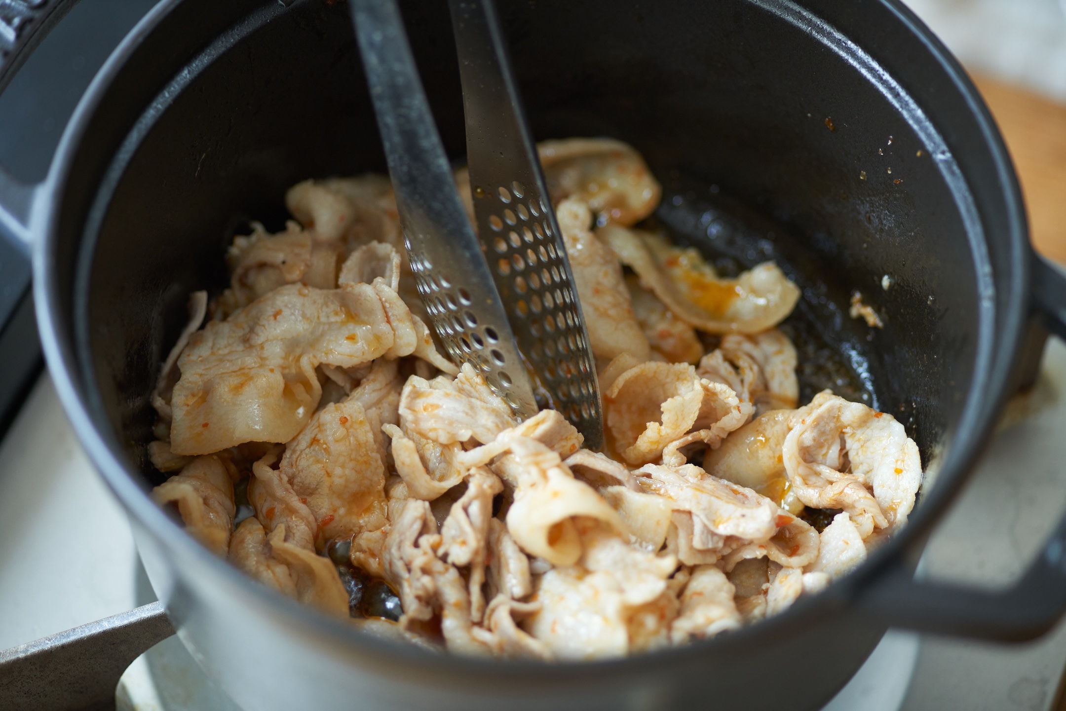 豚肉の色が変わったら一度取り出し、キムチ、長ねぎ、しめじを加えて炒める。
