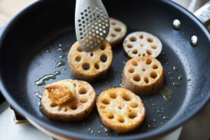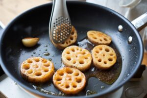 れんこんは1.5cm程度の厚さに輪切りにする。