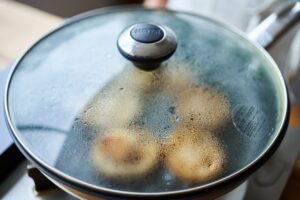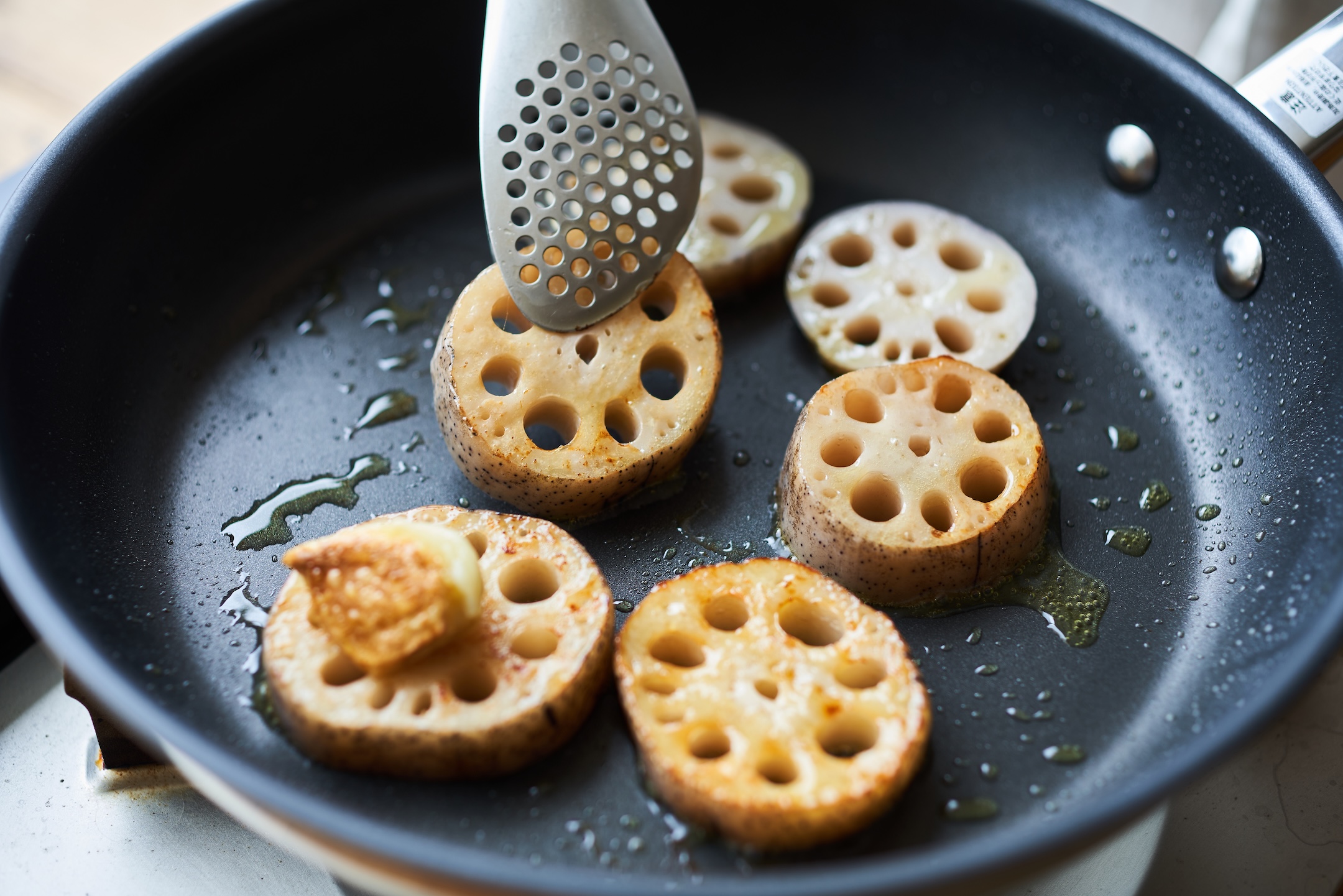 香りが出たられんこんを加えて蓋をし、7分ほど加熱する。