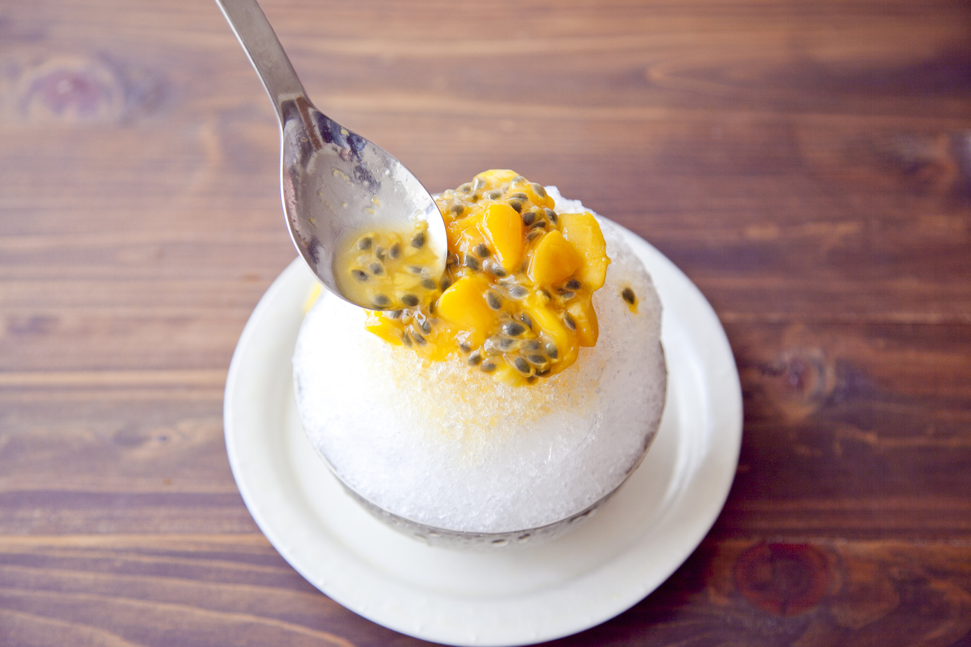 マンゴーとパッションフルーツを使った、夏らしいかき氷です。