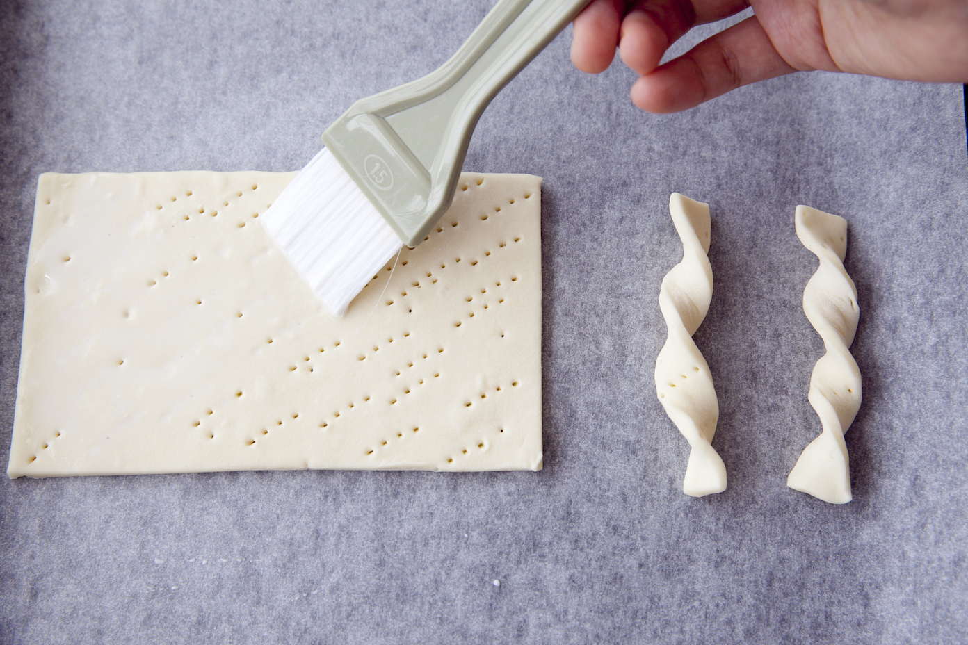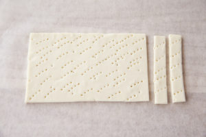 【1】パイシートは全体にフォークで穴をあけ、端から2cm幅に2枚切り取り、ねじる。