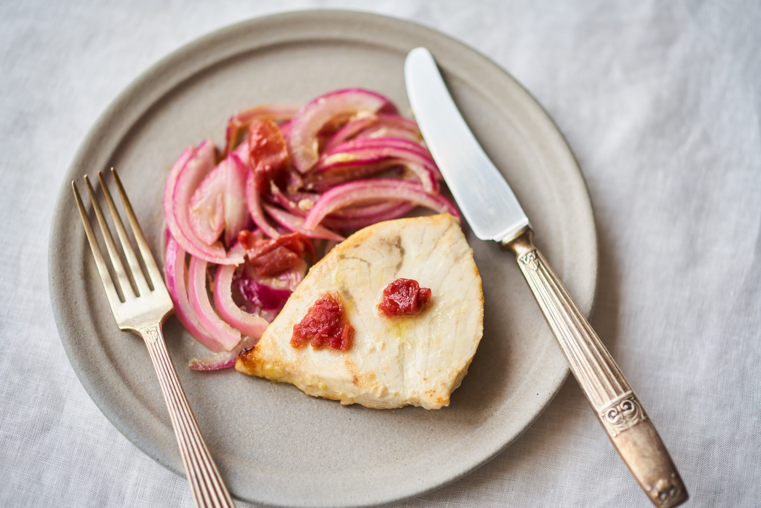 かじきに軽く焼き目がついたら上下を返し、弱火にして紫玉ねぎ、漬けだれを加える。