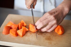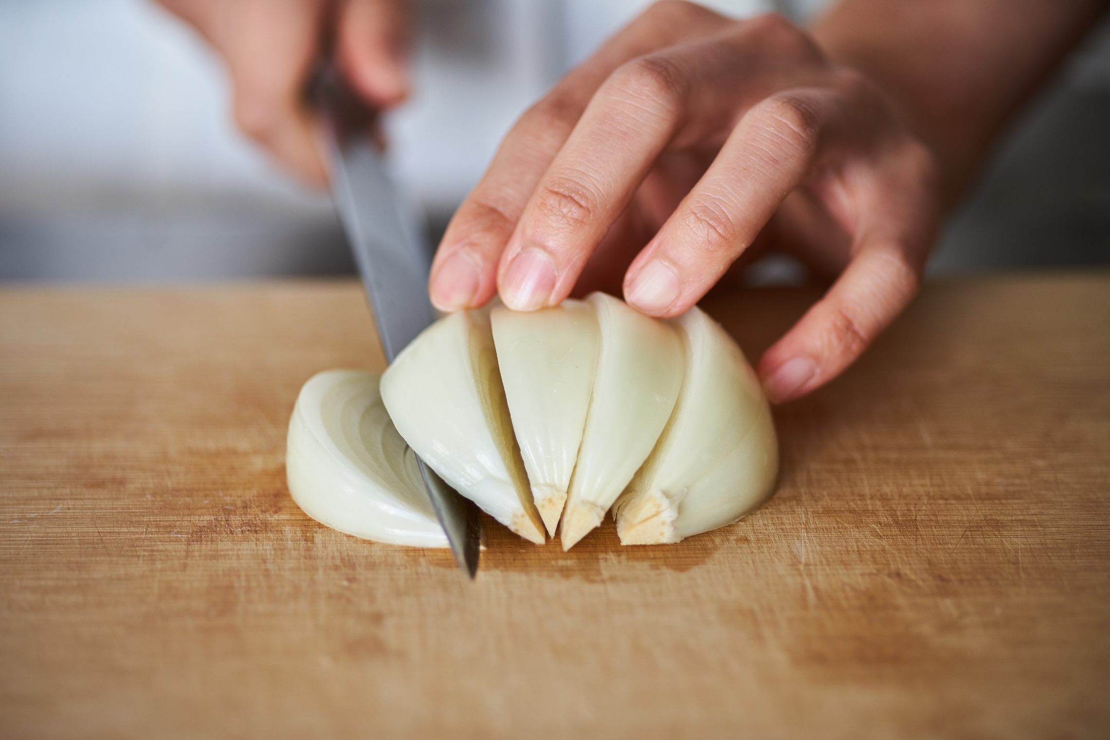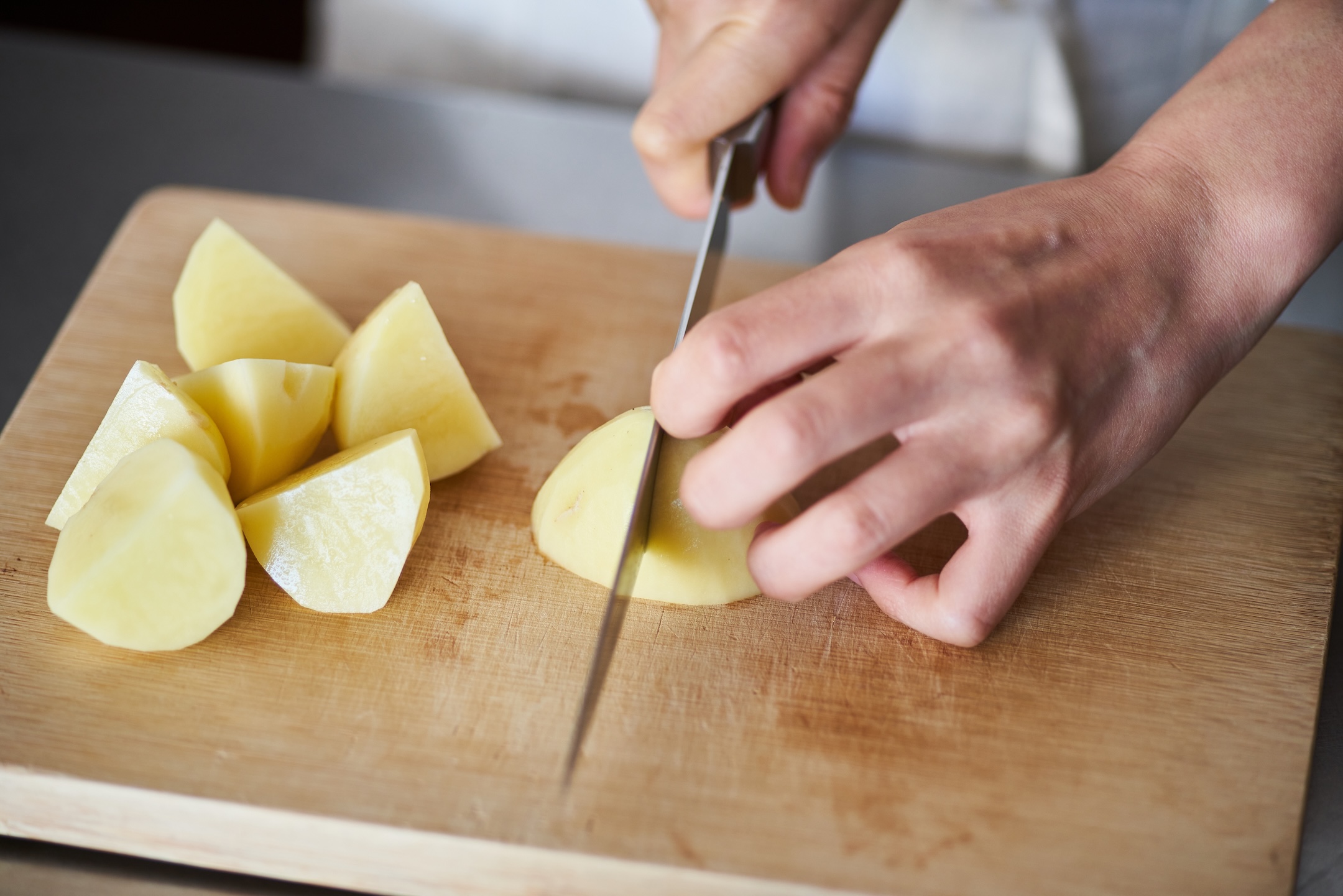 じゃがいもは4等分、にんじんは乱切り、玉ねぎは2cm幅のくし切りにする。