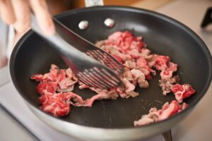 フライパンに米油を中火で熱し、牛肉を炒める。色が変わったら一度取り出す。
