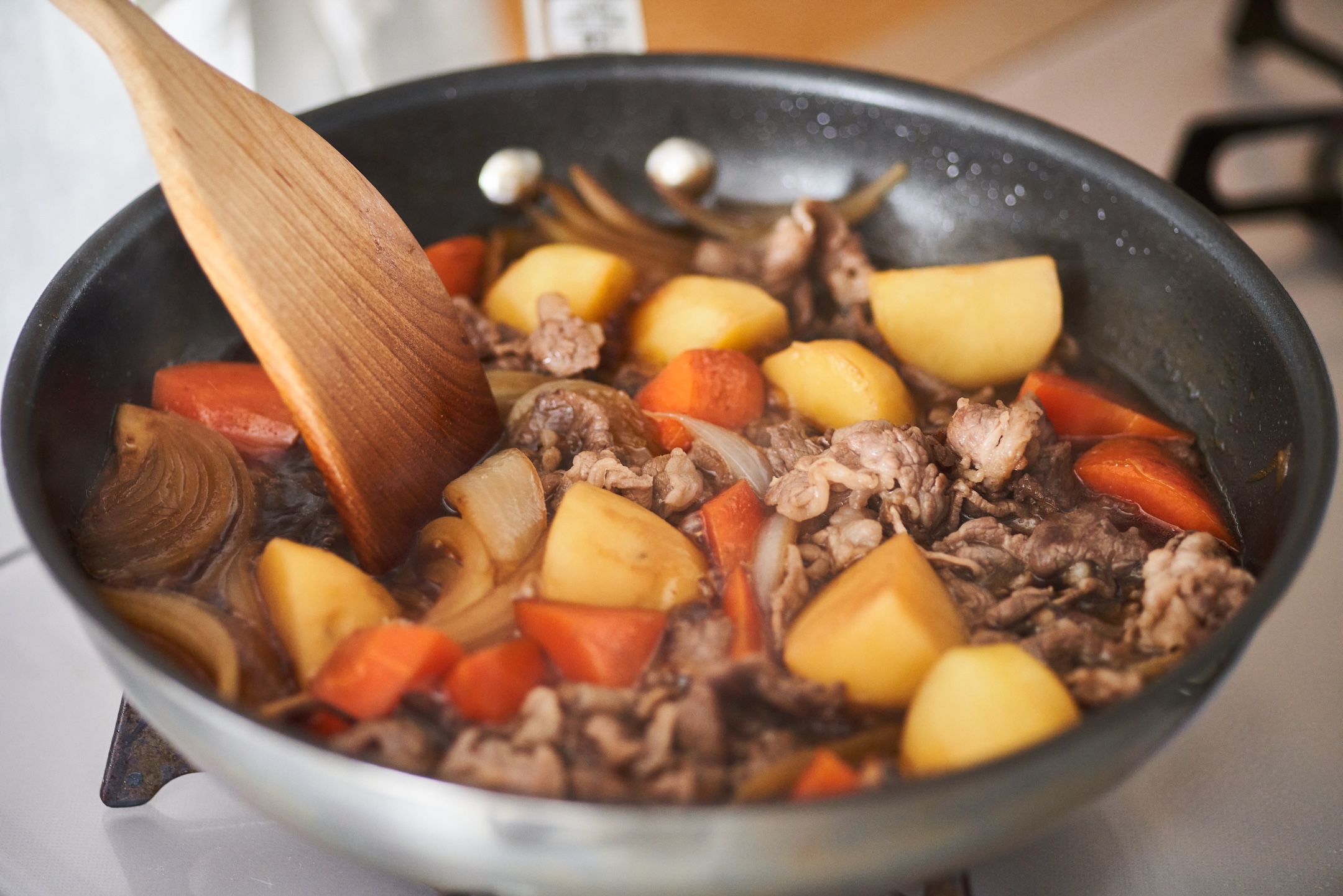 だし汁なし、フライパンで簡単に美味しく作れる「基本の肉じゃが」のレシピです。