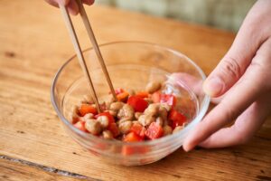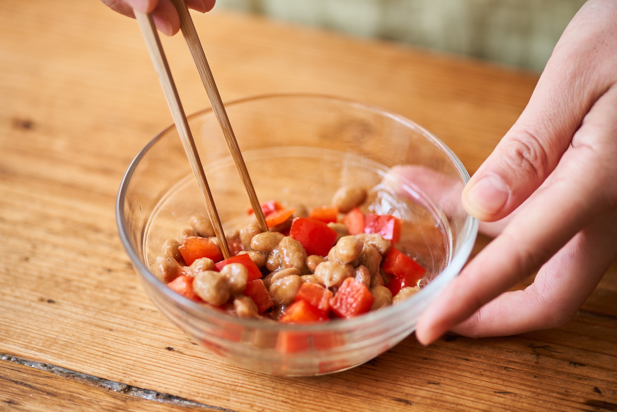 納豆とパプリカを合わせるとシャキシャキ食感も美味しいです。